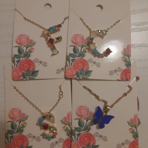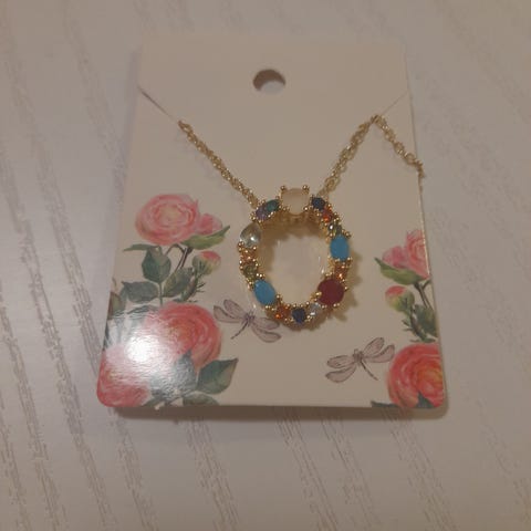 Gullfarget halskjede med bokstav J-anheng dekorert med fargerike steiner.
