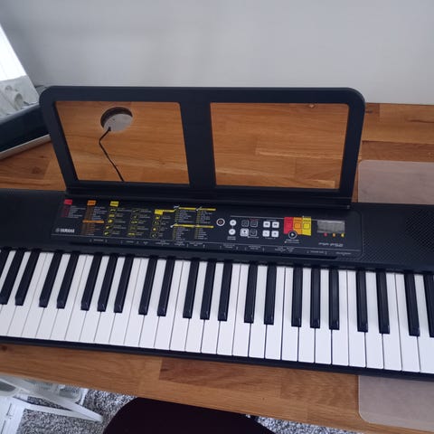 Casio CTK-3500 med stativ. Er påklistret noter på tangentene. Høyden på stativet kan justeres og det kan klappes sammen for å sette vekk.