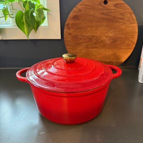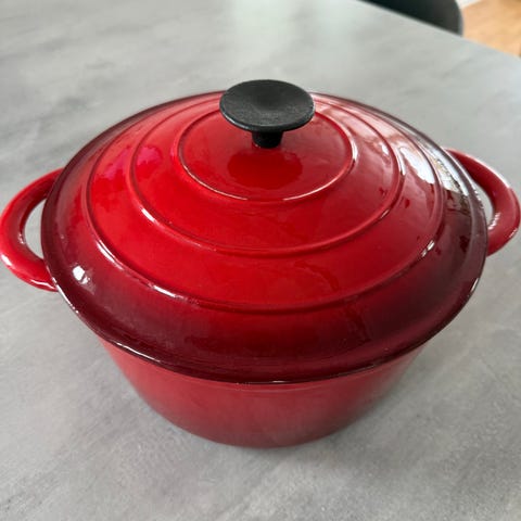 Selger en klassisk oval støpejernsgryte fra franske Le Creuset i den ikoniske fargen Cerise (rød). Dette er en svært allsidig størrelse som rommer ca. 4,1 liter, noe som er perfekt for alt fra langstekt kylling og små steker til eltefritt brød.