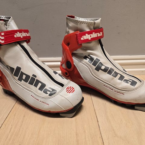 Alpina Racing Junior langrennssko i hvit og rød farge. Modellen er en juniorsko for klassisk langrenn, med snøring og glidelås i front. Overdelen er i syntetisk materiale med forsterkninger, og sålen er tilpasset juniorbindinger for langrenn. Skoene har høyere skaft for bedre støtte rundt ankelen og er merket som racing-modell for junior.