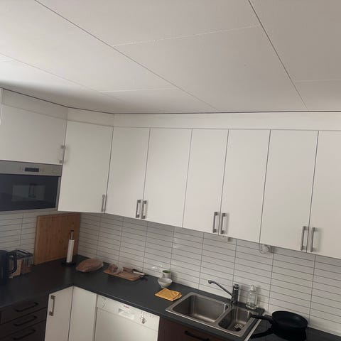 overskap med profilerte fronter i grå utførelse. Fra IKEA, Bodbyn. Skapene har flere høye skapdører og tilhørende skuffer med håndtak i metall. Frontene har klassisk, innrammet profil og glatt overflate. Passer som overskap på kjøkken over benk og arbeidsflate. Egnet for oppbevaring av kjøkkenutstyr, servise og matvarer. Det kan forekomme noe slitasje på ene listen som vist på bildet. Ellers i fin stand. Skal demonteres snart!