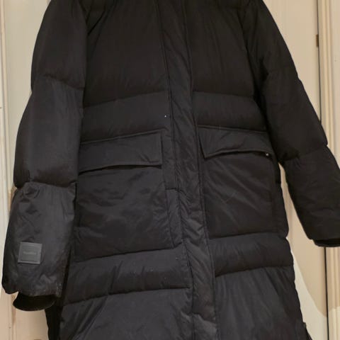 Lindex ytterjakke for dame i størrelse XL. Jakken er svart og laget i polyester. Modellen er en lang, vattert jakke med hette og glidelås foran kombinert med trykknapper. Store frontlommer gir ekstra oppbevaringsplass. Passer som yttertøy på kjølige dager.