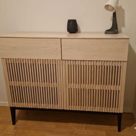 Selger en utrolig flott og moderne skjenk med et stilrent design. Sjalusidører (lameller) gir den et unikt og eksklusivt preg som passer perfekt inn i ethvert moderne hjem.