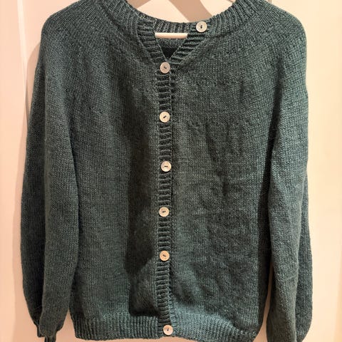 «Igjen»-jakke med raglanfelling. Strikket i kidsilk og alpaca storm.