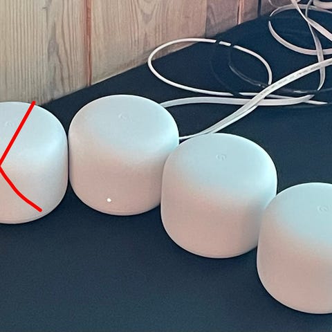 Trådløse mesh-rutere i hvit farge. Enhetene leveres med tilhørende strømadaptere og kabler, og er beregnet for utvidelse eller etablering av trådløst nettverk i hjem eller mindre kontor. Egnet for plassering på bord eller hylle. Nærmere tekniske spesifikasjoner som hastighet, rekkevidde og produsent er ikke oppgitt.