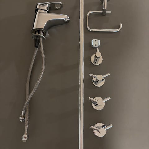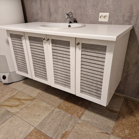 Brun vask på heimelaga skap gjevast vekk. Mål på innredningen er ca. 69 x 48 cm. Underskapet har dør med håndtak for oppbevaring. Servanten har ett-greps blandebatteri montert på toppen.