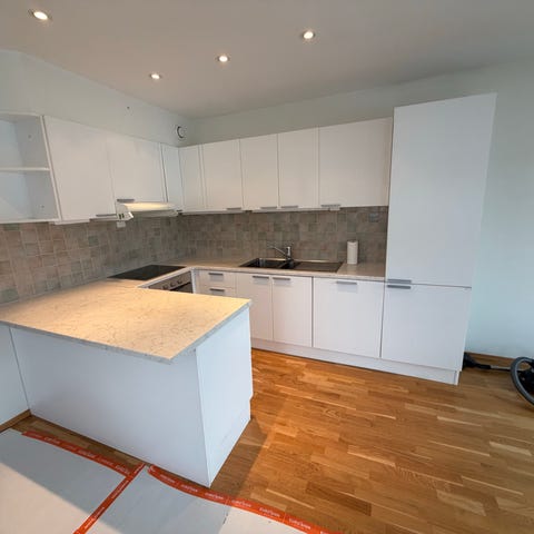 Kjøkkeninnredning i hjørneløsning med over- og underskap i hvit høyglans. Det er forliset i svart, så bare å dra av. Overskapene er lyse med glatte fronter og lange, rette håndtak i metall. Underskapene er mørke med tilsvarende håndtak, og benkeplaten er lys. Kjøkkenet har integrert platetopp og stekeovn, samt opplegg for kjøkkenvask under vindu. Det er veggmonterte hyller ved siden av vinduet og belysning under overskapene.