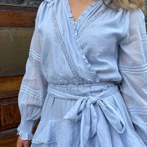 Neo Noir sommerkjole i hvit bomull for dame i one size. Kjolen har omslagssnitt med V-hals og knytebelte i livet. Overdelen har lange ermer med lett volum og mansjetter. Detaljer med blonder og innfelte sømmer gir et lett og luftig uttrykk. Skjørtet er lagdelt med volanger som gir bevegelse i plagget. Passer som sommerkjole til hverdagsbruk eller enkle anledninger.