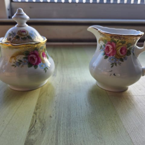 Fløtemugge og sukkerkopp i rosemønster. 100kr pr del. Må hentes I Skotselv. Sender ikke
