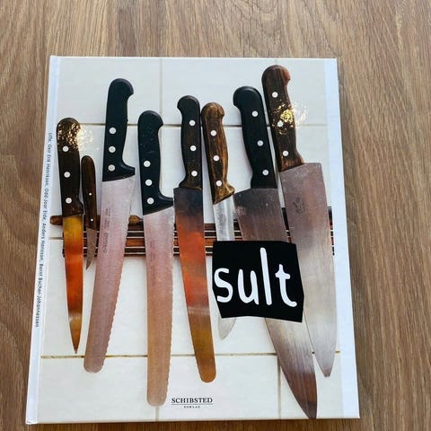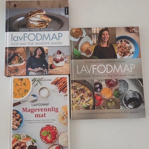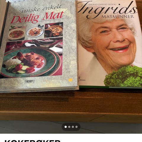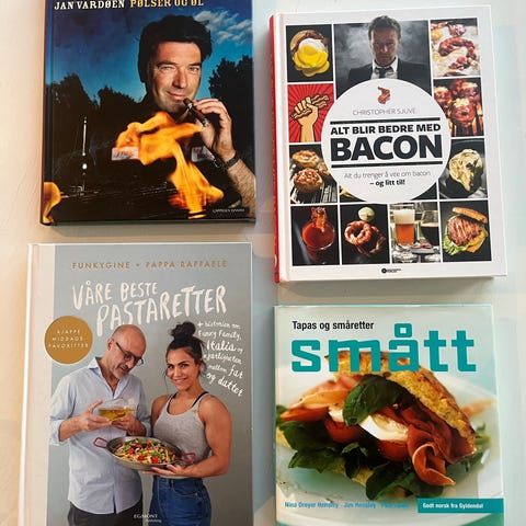 Sett med tre kokebøker: «Bare mat» av Hellstrøm, «Kok & stek» fra Kulinarisk Akademi og «Sommermat». Alle bøkene er innbundet og pent brukt.