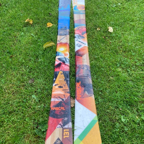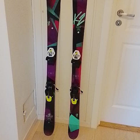 Twintip ski med Marker 7.0 bindinger. Binding på venstre ski er i ustand ved at «stopper» som justerer lengden på bakbindingen er borte. Se for øvrig bilder.