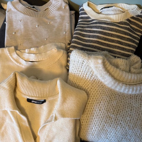 Noen av klærne har bruksmerker, noen ikke brukt.