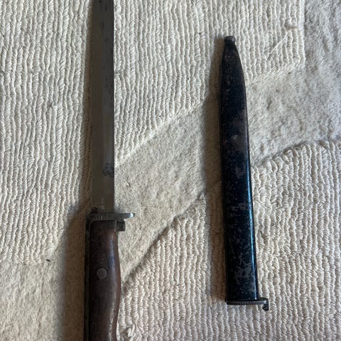 Sveitsisk M/1918 bajonett for Schmidt Rubin rifle. Bajonetten er i meget bra stand. Balgen har en bulk på baksiden (ikke synlig fra framsiden) og ellers i bra stand. Pen og dekorativ bajonett.