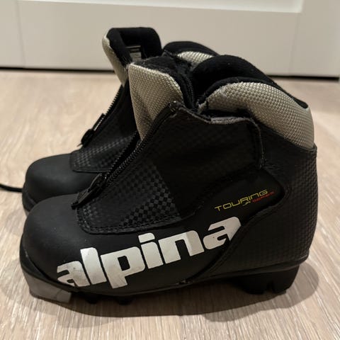 Alpina T8 Jr langrennsstøvler i størrelse 28. Modellen er en barne/junior skistøvel for langrenn. Fargekombinasjon svart og grå med glidelås i front og lisser under klaff. Overdel og såle i syntetisk materiale.