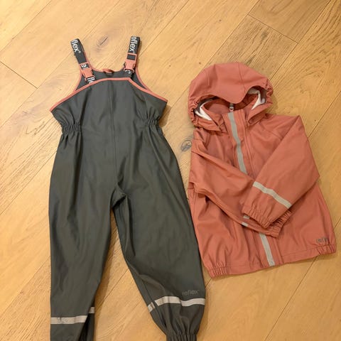 Reflex regntøysett for barn i størrelse 104, unisex. Settet består av regnjakke med hette og regnbukse med seler. Farge rosa. Materiale i polyester med påsydde refleksdetaljer. Buksen har forsterkede knær og helt ny fotstrikker nederst. Elastikk ved ermer og ben for bedre passform.