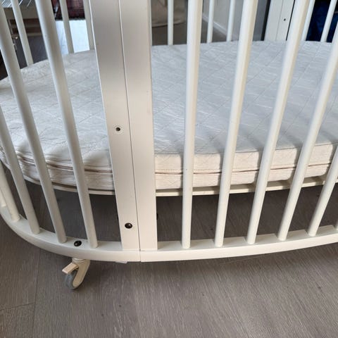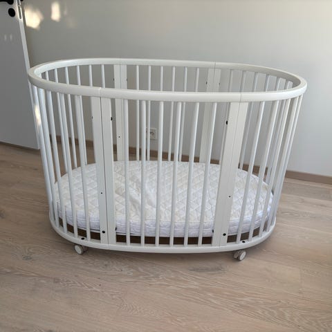 Stokke sprinkelseng i hvit utførelse. Sengen har ovalt design med sprosser rundt hele og står på hjul for enkel forflytning i rommet. Kan heves og senkes. Mini utgaven blir som en liten seng til nyfødt, kan bygges om for større seng som kan brukes opp til 4 års alderen. Pent brukt madrasser med. Også laken tilhørende laken/madrassbeskytter om ønskelig.