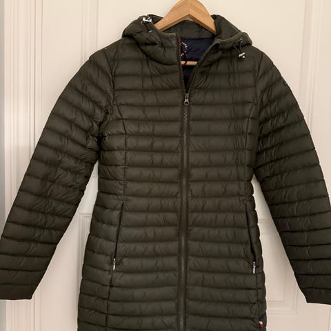 Jean Paul dun vinterjakke i størrelse S. Jakken er oransje og fylt med dun. Den har høy krage, hette og glidelåslukking foran. To sidelommer med glidelås. Logo på ermet. Egnet som ytterjakke i kaldere vær.