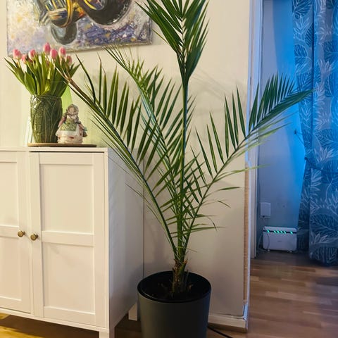 Grønn stueplante i potte. Planten har store, avlange blader med lysere mønster og står i en mørk rund potte. Egner seg som inneplante i stue, gang eller andre oppholdsrom. Kan plasseres på gulv eller i planteholder, og gir et grønt innslag i innemiljøet.