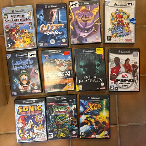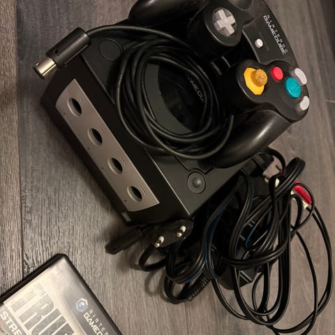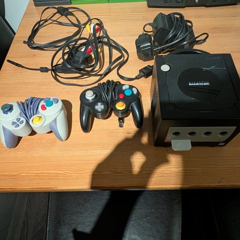 Nintendo Game Cube med en spillekonsoll og tre spill og et minnekort.