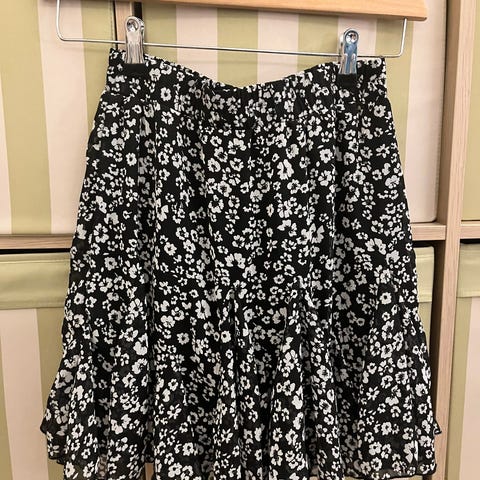 Lett sommerskjørt fra Cubus selges. Sort og hvitt med blomstermønster. Strikk i livet. Pent brukt. Størrelse XXL.
