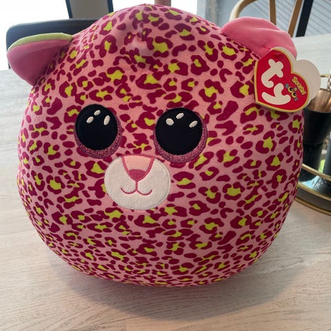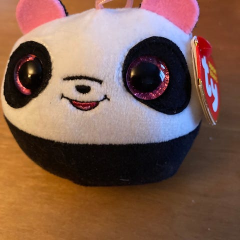 Ty kosedyr i rund plyshform, med store broderte øyne og dyremotiv. Figuren er laget i mykt, flerfarget plysjstoff og egner seg som lekedyr eller pyntefigur på barnerom. Selges for 100 kr pr stk