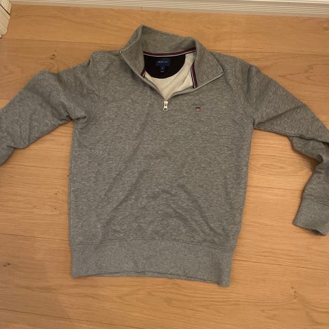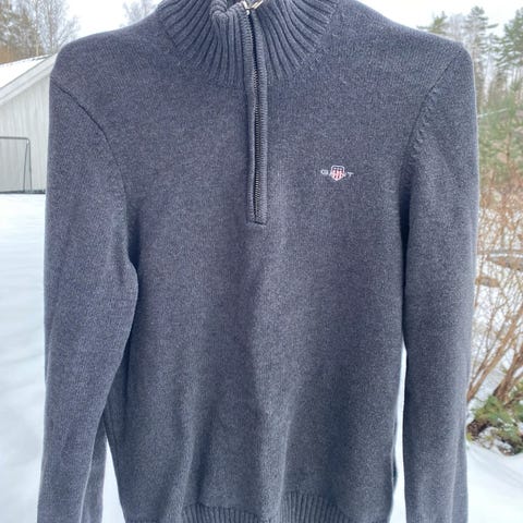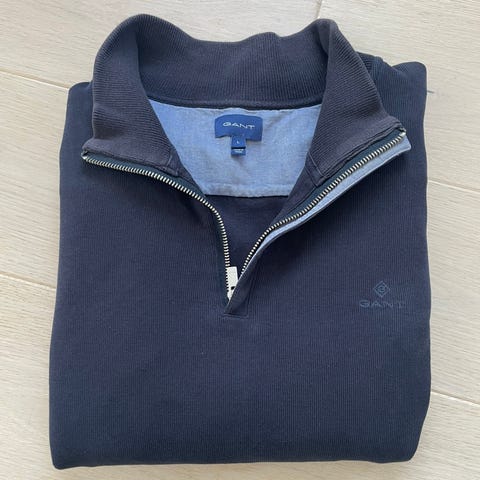 GANT Half Zip-genser for herre i størrelse M. Genseren er mørk blå og laget av bomull (Pima Cotton). Den har høy hals med glidelås i kontrastfarge og ribbekanter nederst og på ermene. Diskré Gant-logo på brystet. Passer til hverdagsbruk og som et ekstra lag over skjorte eller T-skjorte.