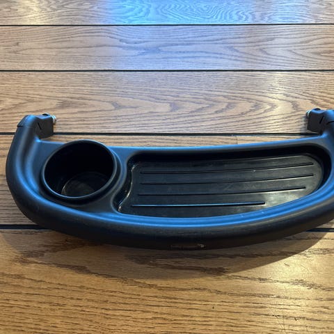 Baby Jogger Child Tray Double Mini 2/GT2 barnevognbrett i svart plast. Brettet er tilpasset Baby Jogger City Mini 2 Double og City Mini GT2 Double. Det har en innebygd koppholder og et flatt brettområde foran barnet. Festes på rammen foran sitteenhetene for å gi barnet en praktisk plass til drikke og småting under trilleturen.