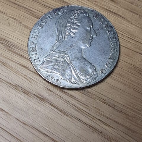 Maria Theresia Thaler sølvmynt. Forsiden viser portrett av Maria Theresia med inskripsjon langs kanten. Baksiden har dobbeltørn med riksvåpen og tekst rundt. Mynten leveres i plastkapsel, som beskytter overflaten mot riper og slitasje. Egner seg til samling eller som historisk samleobjekt.