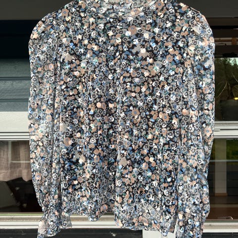 By Malene Birger bluse for dame i størrelse 40. Blusen er laget i viskose og har et flerfarget mønster med metallisk preg. Modellen har lange ermer og rund hals. Stoffet er vevd og gir et strukturert uttrykk. Veldig tøffe puff-ermer! Passer til bruk sammen med både bukser og skjørt i ulike anledninger.