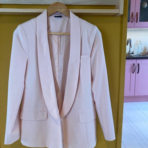 Cubus blazer jakke for dame i størrelse 38. Jakken er i nydelig rosa farge. Klassisk modell med krage, slag og to knapper i front. Lommer foran og helfôret innside. Passer til bruk som penjakke eller til hverdags i kombinasjon med bukse eller skjørt. Jakken er pent brukt, noen nupper i halsen (se bilde).