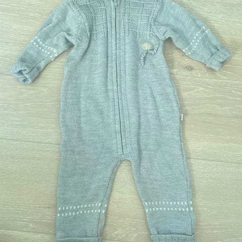 Lillelam ulldress i størrelse 80 for unisex barn. Dressen er i grønn ull med hette og glidelås foran. Den har mønsterstrikk på bryst, ermer og ben samt ribbestrikkede mansjetter ved ermer og ankler for bedre passform. Egnet som ytter- eller mellomlag for små barn i kjøligere vær.