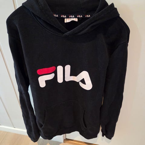 Fila hettegenser for barn i størrelse 152 (ca. 11–12 år). Genseren er svart med stor Fila-logo på brystet og mindre logo bak nede. Unisex-modell. Pent brukt, ingen skader