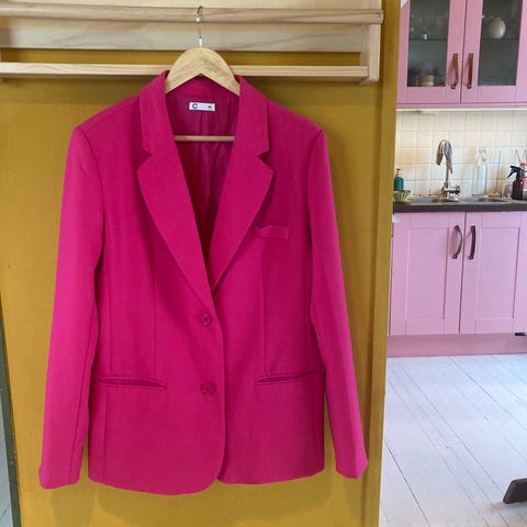 Cubus blazer for dame i størrelse 38. Blazeren er rosa med et annerledes og kult snitt. Modellen har enkel knepping foran, slag og lommer foran. Baksiden har splitt nederst for bedre passform og bevegelse. Egner seg til bruk både til hverdags og mer formelle anledninger. Pent brukt.