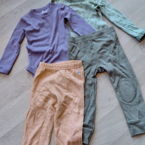 1 singletbody og 1 kortermet body i str. 90 (86/92) for å ha under feks. tynne ullgensere. Svake flekker på den lyseblå bodyen, ellers ingen flekker.