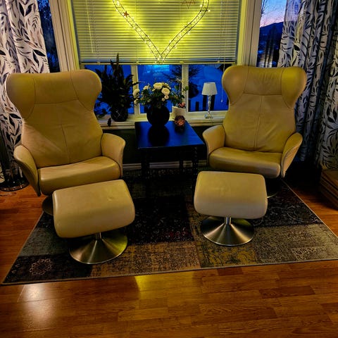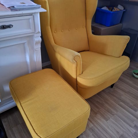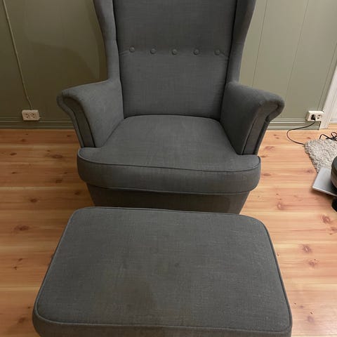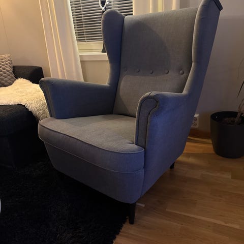 Strandmon ørelappstol. God å sitte i. Må rengjøres, vil da bli som ny. Har reparert, da den ble knekt. Se bilder. Mye stol og skammel igjen her. Selges billig.