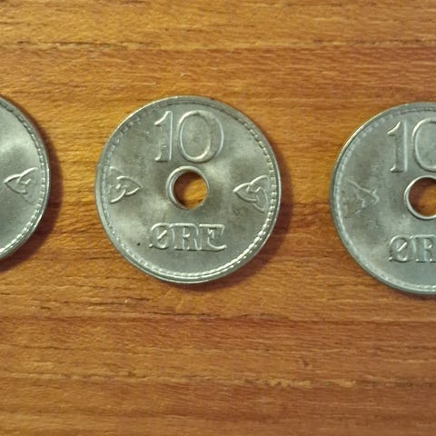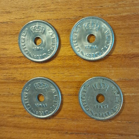 Norges Bank 10 øre mynter med hull i midten. 1 stk 1941 kv. 0/01 kr 40,- 2 stk 1945 kv 0, kr 200 pr stk Kan sendes i posten mot porto kr28,-