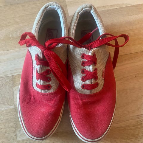 Vans sneakers i størrelse US WOMAN 6.5. Skoene er i burgunder tekstil med hvit såle og brune lisser. Innvendig har de fargerikt mønster rundt åpningen og detalj i brunt kunstskinn ved hælen.