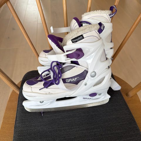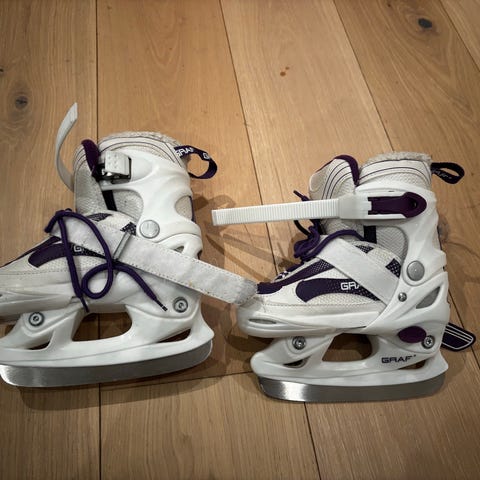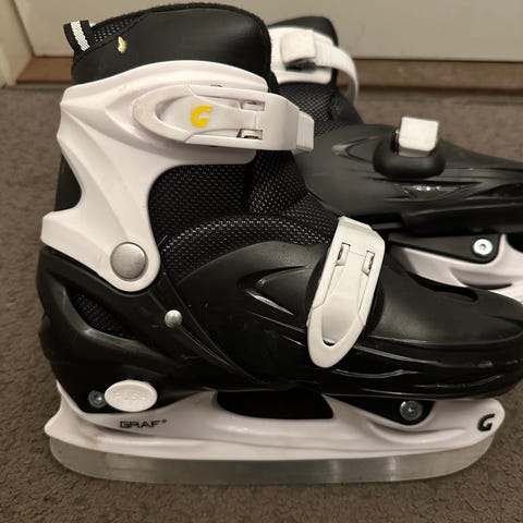 Graf justerbare skøyter for barn i størrelse 30. Skøytene har hard yttersko med spenner for enkel tilpasning og støtte rundt ankelen. Fargekombinasjon svart og hvit. Egnet til generell skøytebruk på isbaner og uteis for barn som trenger stabile og justerbare skøyter.
