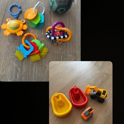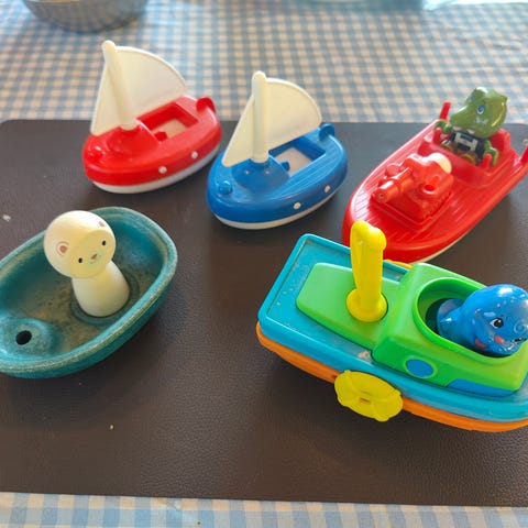 Det meste av lekene er godt brukt og bærer preg av det. Selger kjenner til at magneten på fiskestangen har falt ut og det går derfor ikke av å fiske opp fiskene som har magnet på seg. Det er også noe rust på fiskestanga. Maneten som er oransje og turkis kan i utgangspunktet lyse når den er i vann, men må nok ha nytt batteri. Usikker på om den likevel fungerer. Se ellers bilder for tilstand på lekene.