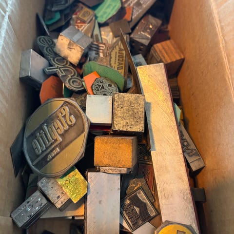 Selger noen veldig gamle stempler og 2 stempelputer. Følger og med en metallboks som noe av dette oppbevares i. Den en stempel er messing i bunn.