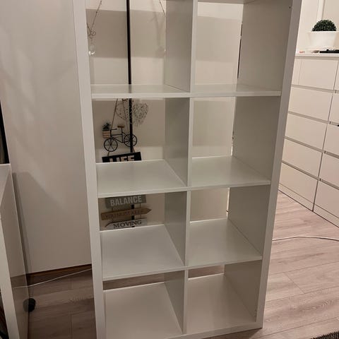 Har satt inn skuffeseksjoner som hører til, de tre nederste hyllene er derfor seks praktiske skuffer. Dette kan fjernes om man ønsker. Har gjort dette selv tidligere derfor er det noen små skruehull. Dette kan lett fikses om man ønsker å pusse over, nesten ikke synlig når hyllen er i bruk.