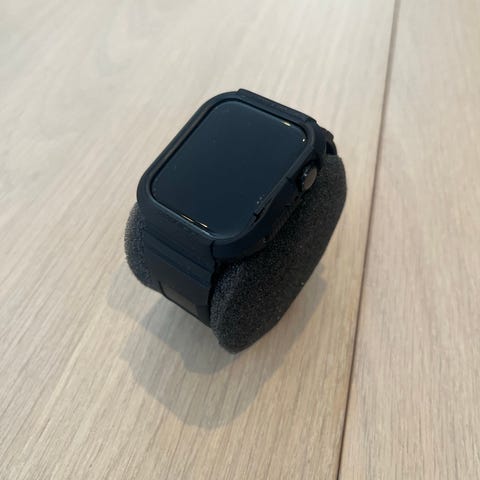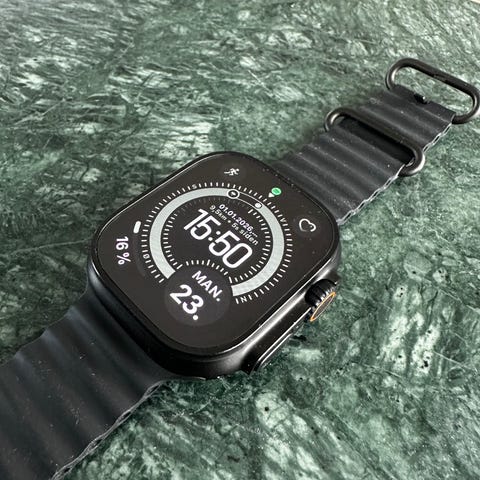 Apple Watch Ultra smartklokke med 49 mm urkasse i titan og svart silikonreim. Klokken har rektangulær skjerm og integrerte sensorer på baksiden for måling av blant annet puls og aktivitet. Reimen er justerbar og festes med spenne. Egnet til daglig bruk og trening, og kan kombineres med andre kompatible Apple Watch-reimer etter behov.