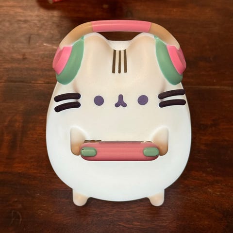 Etui til trådløse ørepropper med kattemotiv. Etuiet har hvit basefarge med trykk av katteansikt i svart og rosa. Leveres med karabinkrok for enkel festing til veske, sekk eller beltestropp. Passer til oppbevaring og beskyttelse av et kompatibelt ladeetui for ørepropper.