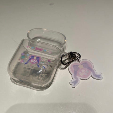 Airpods etui med kattemotiv i hvit farge. Etuiet har et festebelte med karabinkrok for enkel opphenging.