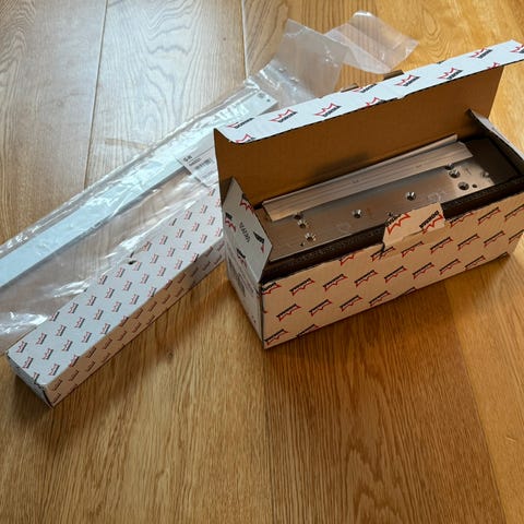 Dorma TS 93 dørlukker. Mekanisk dørlukker med glideskinne og monteringsplate, egnet for innvendige eller utvendige dører der det er behov for kontrollert lukking. Leveres som vist på bildene, med hovedenhet, glideskinne og monteringsplate i metall.