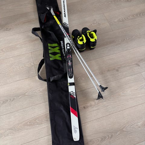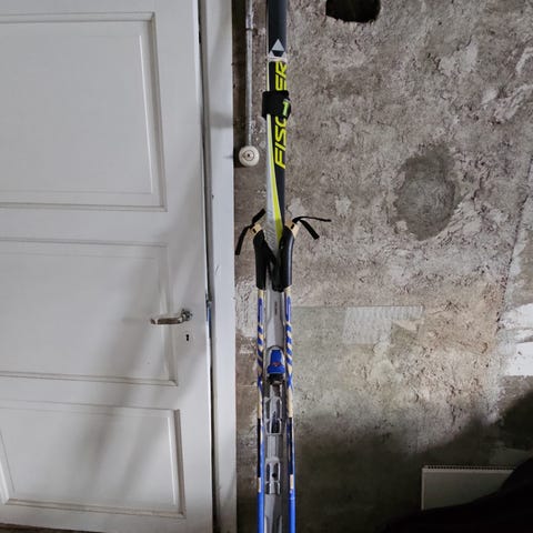 Fischer langrennspakke med ski, staver og skisko. Skiene er klassiske langrennsski med smørefri såle