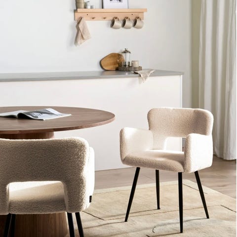 Billie spisestol i offwhite er en moderne spisestol, som passer sammen med de fleste spisebord og til de fleste stiler. Billie spisestol kommer i et mykt, moderne bouclétekstil med sortlakkerte metallben.