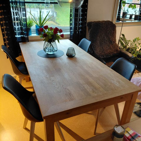 Spisebord er 180×89cm. Usikker hvor det ble kjøpt. Er mulighet for å forlenge det. 6 spisestue stoler kjøpt på Jysk.