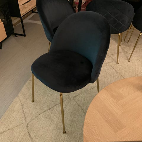 Theo spisestoler i svart stoff med polstret sete og rygg. Stolen har slanke ben i metall og heltrukket sete og rygg for jevn overflate. Egnet som spisestol rundt spisebord, men kan også brukes som ekstra sitteplass i stue eller andre rom. Nøytral farge som gjør den enkel å kombinere med ulike bord og interiørstiler.