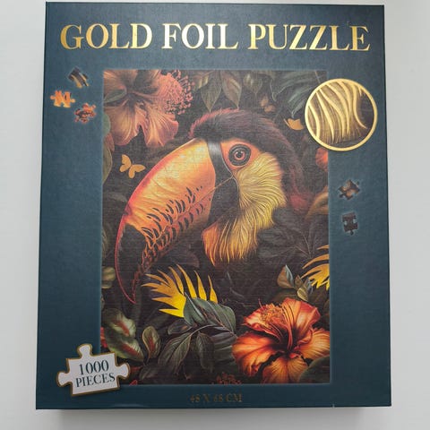 Gold Foil Puzzle puslespill med 1000 brikker og motiv av papegøye.